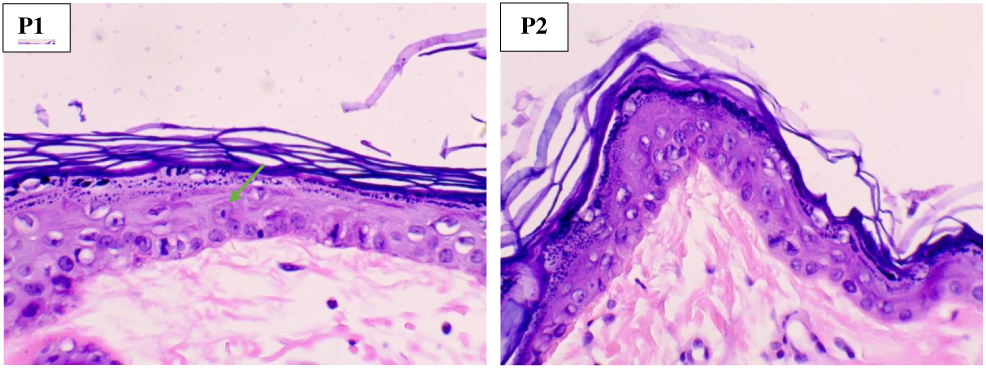 Fig. 2. Histological features of the epidermis of rat skin after treatment (Hematoxylin eosin staining, magnification 400x). The green arrow indicates sunburn cells are more visible in group P1 than P2.