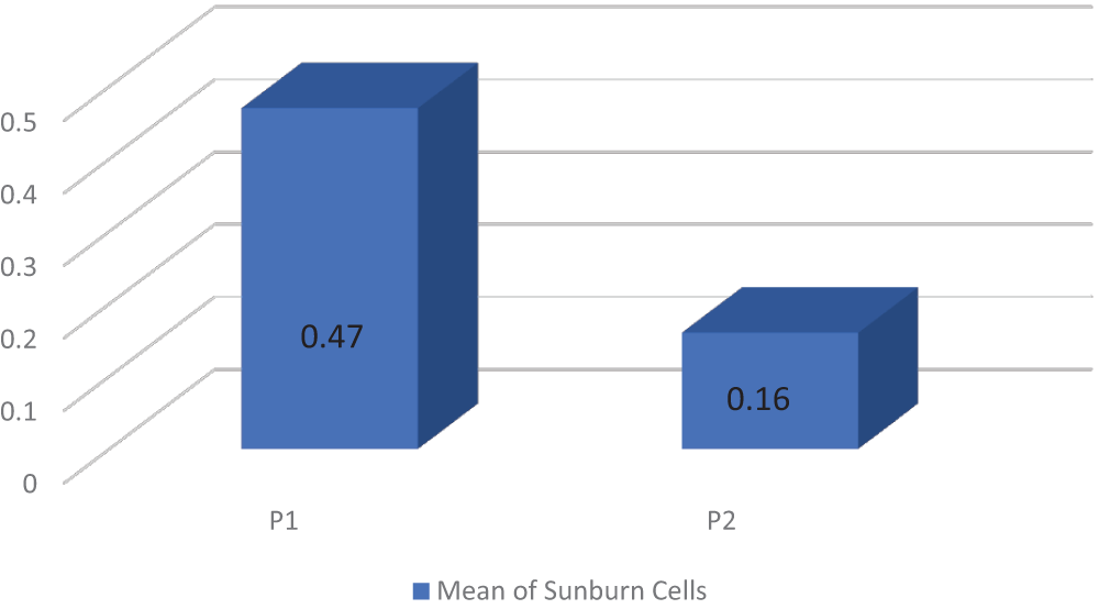 Table I shows that there is a significant difference in the number of sunburn cells in the sunscreen without astaxanthin (P1) and sunscreen with astaxanthin (P2) groups (p < 0.001). The mean of sunburn cells in the P1 group was 0.47 cells per high power field and P2 was 0.16 cells per high power field in Fig. 1. Sunburn cells are shown in Fig. 2, where there are more in group P1 than P2. The P2 group did not appear to have sunburn cells.
