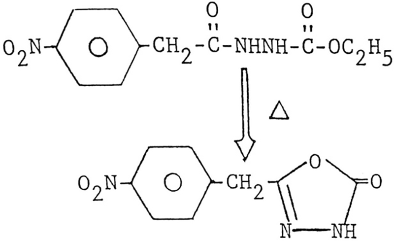 This new β-Carboethoxy hydrazine was prepared (Scheme I), and characterized by MP, IR, 1H NMR, and elemental analysis. To force ring closure, this β-Carboethoxy hydrazine was sublimed but only a more purified non-cyclized starting material formed. The next attempt was that the β-Carboethoxy hydrazine was refluxed with phenyl ether for two hours. This succeeded in generating a new oxadiazole-2-one (Scheme II), which was characterized by MP, IR, 1H NMR, and elemental analysis.